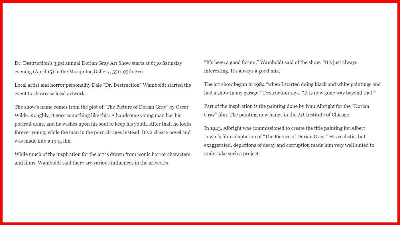 The Mosquitoe Gallery played host to Dr. Destruction's 33rd Annual Dorian Gray Art Show. Live production of the Dr. Destruction and Lilith Lovecraft stage show.
